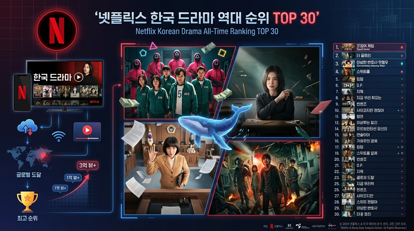 이 글에서는 넷플릭스 오리지널 한국 드라마와 넷플릭스에서 동시 방영된 TV 드라마를 모두 포함하되, 구분하여 정리했습니다. 시청시간은 넷플릭스 공식 데이터(netflix.com/tudum/top10)와 나무위키 집계, 언론 보도를 교차 확인하여 최대한 정확한 수치를 반영했습니다.
