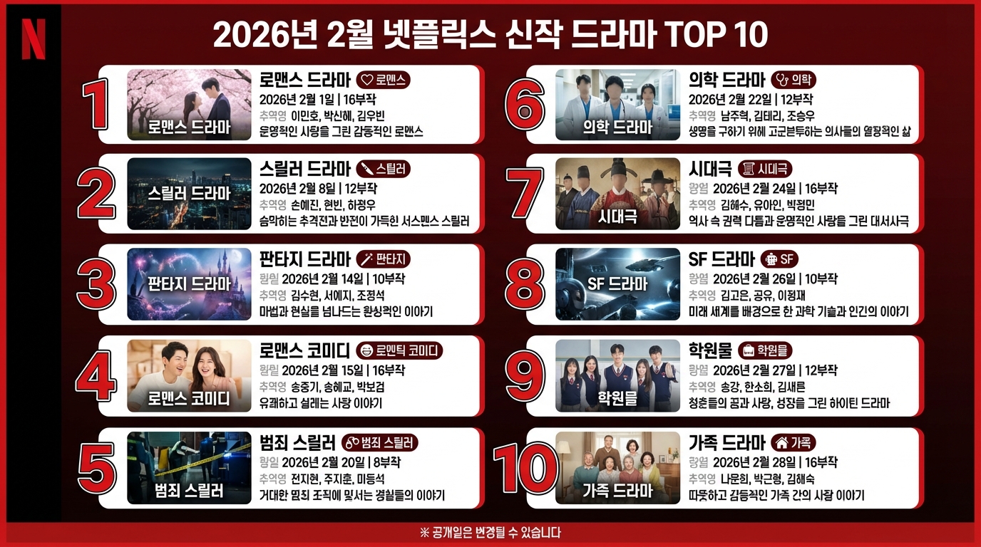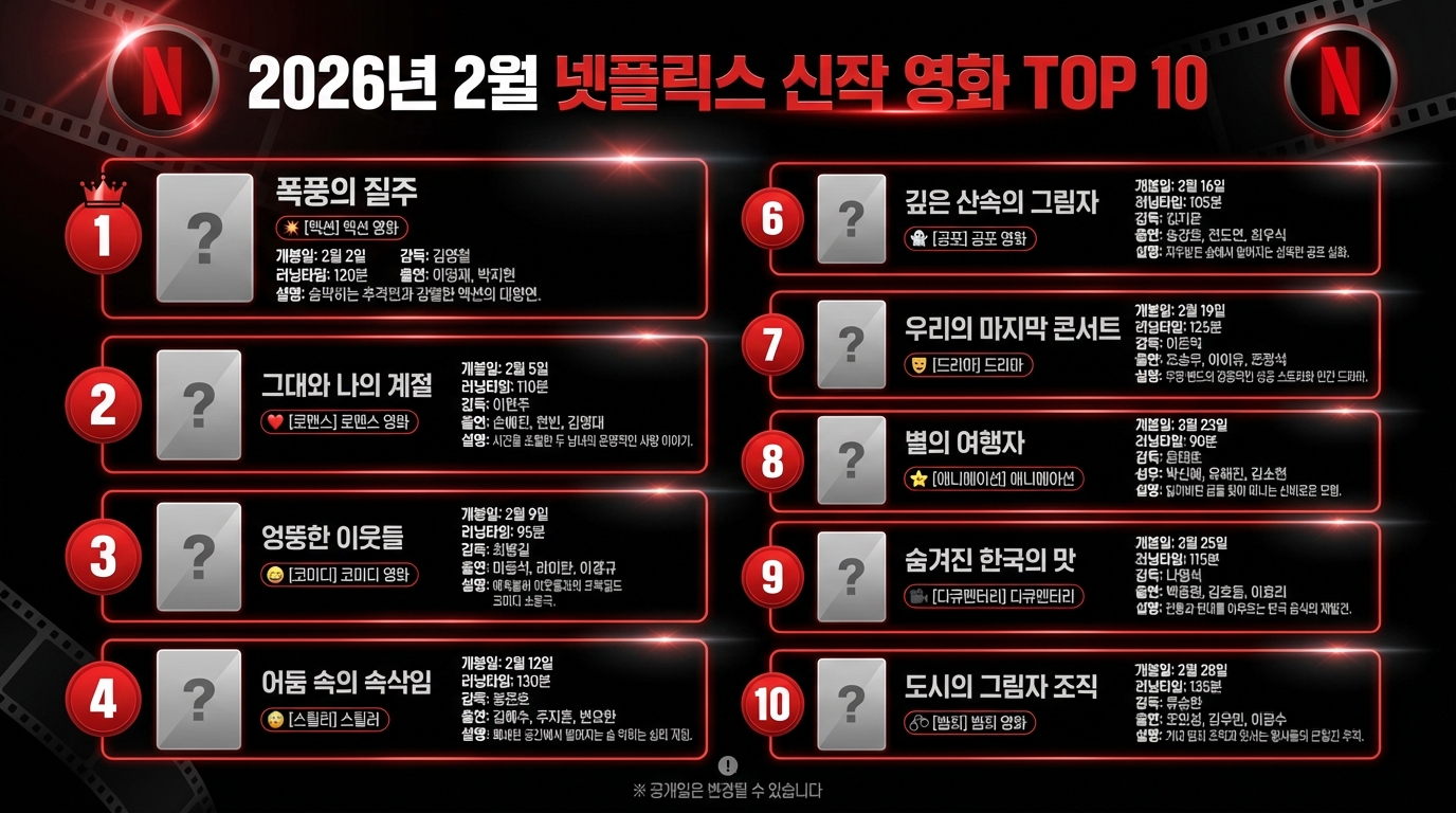 이 가이드는 2026년 2월 넷플릭스에서 공개되는 드라마, 영화, 예능, 다큐멘터리 신작을 총정리한 것입니다.