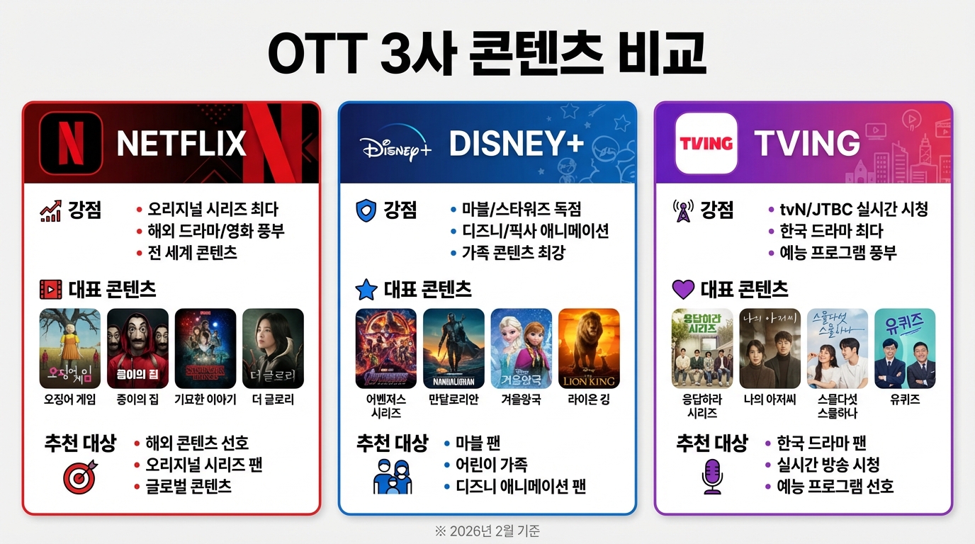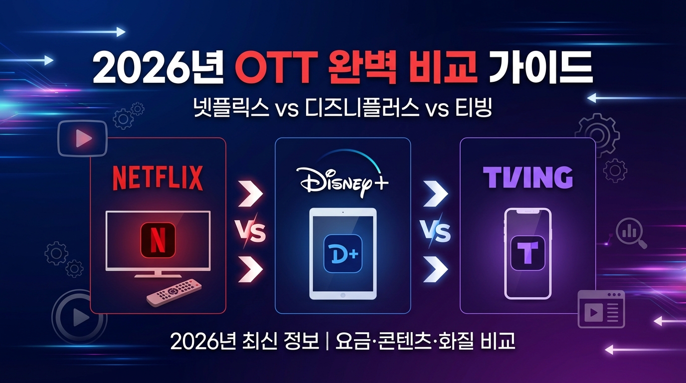 2026년 현재 한국 OTT 시장은 넷플릭스, 디즈니플러스, 티빙 3강 구도입니다. 각 플랫폼의 특징을 정확히 비교하여 나에게 맞는 OTT를 선택하세요!